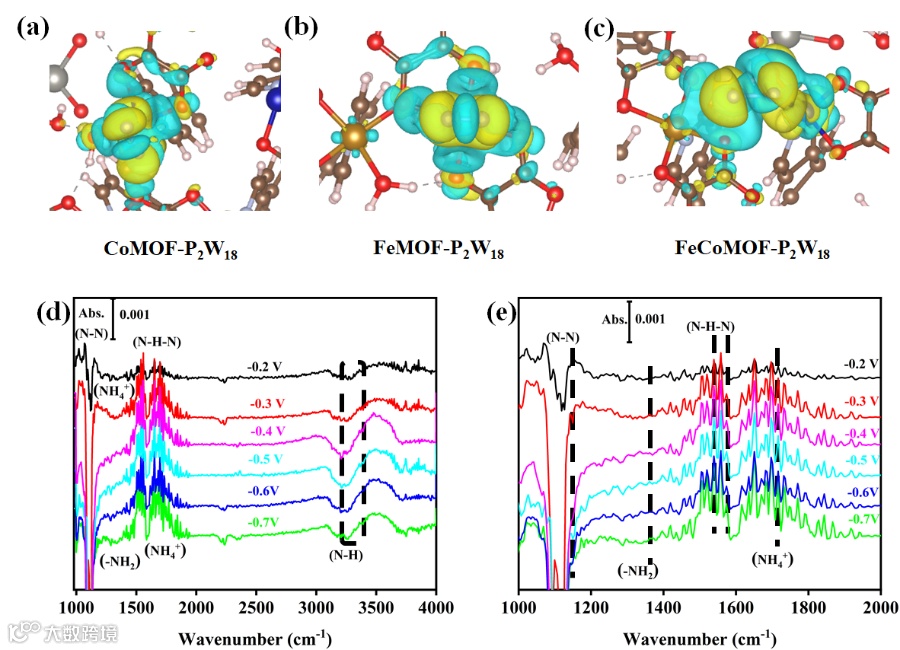 Figure 6. (a)-(c) Charge density difference of N2 adsorbed on the catalysts. The yellow and grass-green contour lines in the figure represent accumulation and consumption of electrons, respectively. (d-e) In situ FTIR spectra from −0.2 to −0.7 V (vs. RHE) on the FeCoMOF-P2W18 in an N2-saturated 0.1 M HCl solution. The reference spectrum was taken at open circuit potential.