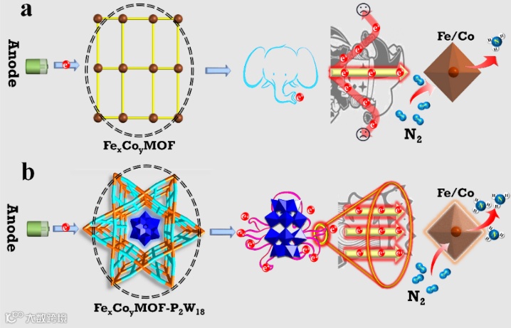 Figure 1. Proposed electron-transfer channel of (a) FexCoyMOF and (b) FexCoyMOF-P2W18 for e-NRR.