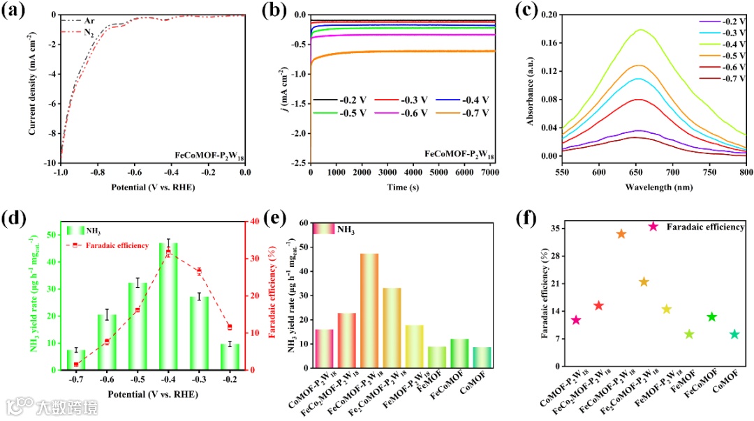 Figure 3. Electrocatalytic performances of FeCoMOF-P2W18: (a) LSV curves in Ar- and N2-saturated 0.1 M HCl. (b) Chronoamperometry test at various potentials. (c) UV-Vis absorption spectra. (d) NH3 yield rates and FE obtained by the indophenol blue method. (e) NH3 yield rates and (f) FEs for FexCoyMOF-P2W18 and FexCoyMOF samples obtained by the indophenol blue method.