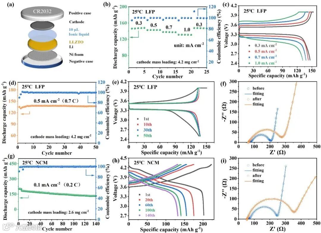 图6 (a) LLZTO-4000组装的固态锂电池示意图。(b) Li/LLZTO-4000/LFP的速率性能。(c)Li/LLZTO-4000/LFP在0.3、0.5、0.7和1.0 mA cm-2下的电压分布。(d)Li/LLZTO-4000/LFP在0.5mA cm-2下的恒电流循环性能。(e)Li/LLZTO-4000/LFP在第1、第10、第30和第50次循环时的电压分布。(f)Li/LLZTO-4000/LFP电池在循环之前和50次循环之后的阻抗图。(g)Li/LLZTO-4000/NCM的循环性能。(h)Li/LLZTO-4000/NCM在第1、第20、第60、第100和第140次循环时的电压分布。(i)Li/LLZTO-4000/NCM在循环之前和140次循环后的阻抗图。