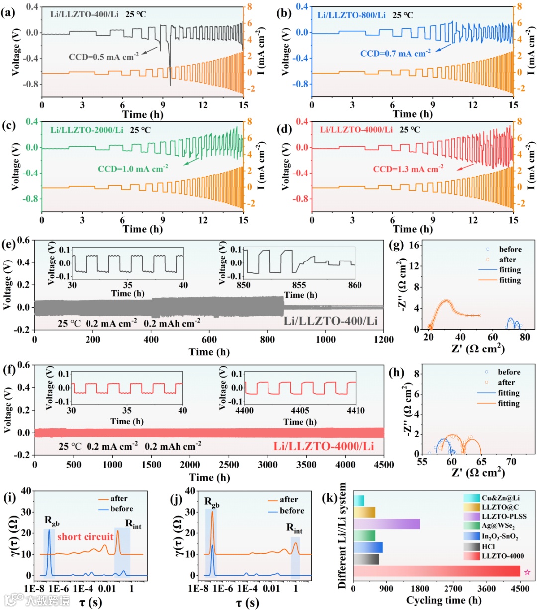 图4 CCD在25°C下对四种LLZTO进行了恒容量测试。(a)LLZTO-400、(b)LLZTO-800、(c)LLZTO-2000和(d)LLZT0-4000的对称Li电池的CCD。(e)LLZTO-400,(f)LLZTO-4000的对称Li电池在25°C下的恒电流循环。(g)LLZTO-400、(h)LLZTO-4000的对称Li电池的EIS谱。(i)LLZTO-400、(j)LLZTO-4000的对称Li电池的DRT演变。(k) 基于LLZTO-4000的Li//Li对称电池与其他报道的基于石榴石电解质的修饰策略在0.2mA cm-2下的循环时间比较。