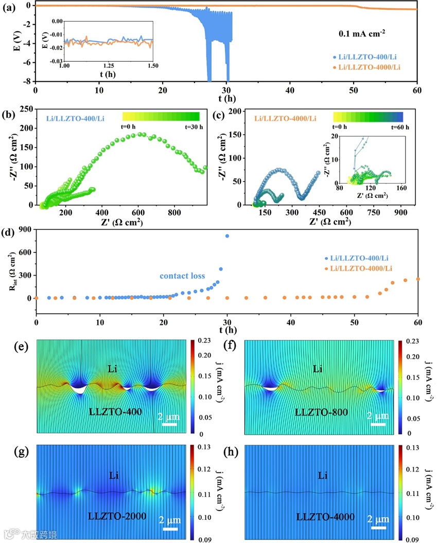 图3 对称电池中单向剥离/电镀期间的奈奎斯特图演变:(a)对称电池中单方向剥离/电镀过程中极化电压的演变。(b)Li/LLZTO-400/Li和(c)Li/LLZTO-4000/Li(为了清楚起见,只显示了几个光谱)。(d)从(a)和(b)中提取的界面电阻的演变。(e)LLZTO-400、(f)LLZTO-800、(g)LLZTO-2000和(h)LLZTO-4000的Li/LLLZTO界面处的电流密度分布的有限元分析。