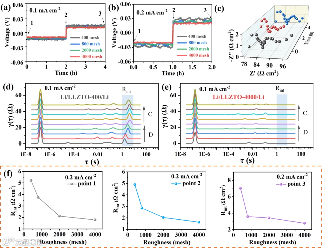 相反,Li/LLZTO-4000/Li电池几乎没有明显的峰,表明其界面动力学优越且稳定。这是由于LLZTO-4000对Li的良好润湿性,提供了良好的Li+传输路径并提高了界面稳定性。在分析相同状态下材料的界面电阻(Rint)时,发现在0.2 mA cm-2下,对称电池的Rint随着LLZTO粗糙度的降低而降低,进一步证明了LLZTO表面粗糙度对在界面建立良好Li+路径的重要性。值得注意的是,通过简单的表面磨抛方法可以实现小至1.7 Ωcm2的小界面电阻,这彰显了该策略在改善界面润湿性和降低界面电阻方面的优越性。
