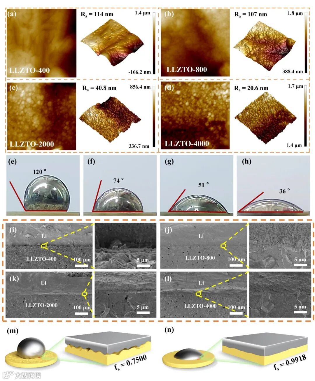 图1 (a)LLZTO-400、(b)LLZTO-800、(c)LLZTO-2000和(d)LLZTO-4000的表面AFM图像(5×5μm)。在300 °C下热处理后,熔融Li金属在(e)LLZTO-400、(f)LLZTO-800、(g)LLZTO-2000和(h)LLZTO-400上的接触角。循环前(i)Li/LLZTO-400/Li、(j)Li/LLZTO-800/Li、(k)Li/LLLZTO-2000/Li和(l)Li/LLTZTO-4000/Li的截面SEM图像。(m)Li/LLZTO-400和(n)Li/LLLZTO-4000的示意图。