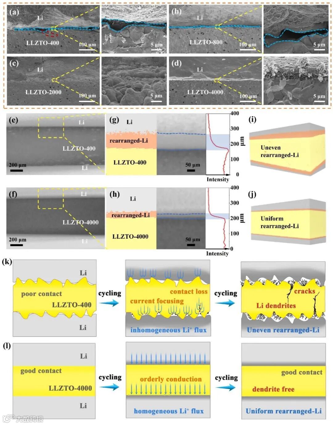 COMSOL模拟结果表明,电流聚焦会随着表面粗糙度的降低而降低(图3f,g),因此,降低LLZTO的表面粗糙度对于构建有序Li+传导的界面具有重要意义。Li/LLZTO-4000界面由于其平坦且紧密接触,电流在界面处传导迅速,没有电流聚焦现象,这有利于锂离子均匀沉积并提高LLZTO的临界电流密度(图3h)。因此,研究结果表明了表面微观结构对于界面演化机制的重要影响,同时也揭示了降低LLZTO表面粗糙度的必要性,以构建具有有序Li+传导的界面。