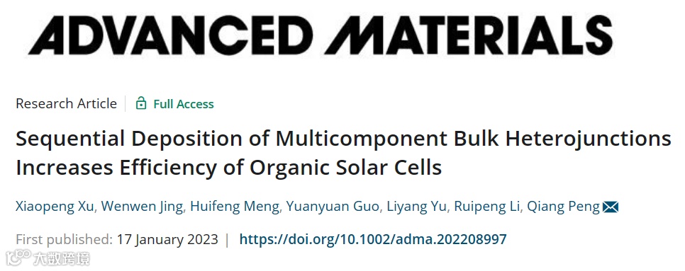 基于此,四川大学彭强教授团队在国际知名期刊Advanced Materials上发表题为“Sequential Deposition of Multicomponent Bulk Heterojunctions Increases Efficiency of Organic Solar Cells”的研究论文,将两个本体异质结活性层逐层沉积在电极上,制备出具有双本体异质结结构的多组分有机太阳能电池,器件性能提升至19.61%,为目前报道的单结有机太阳能电池的最好效率。徐小鹏研究员为文章第一作者,此研究得到国家自然科学基金、校地科技联合基金的支持。