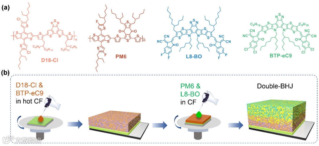 图1. (a)双本体异质结器件使用的给受体材料。(b)双本体异质结逐层沉积示意图