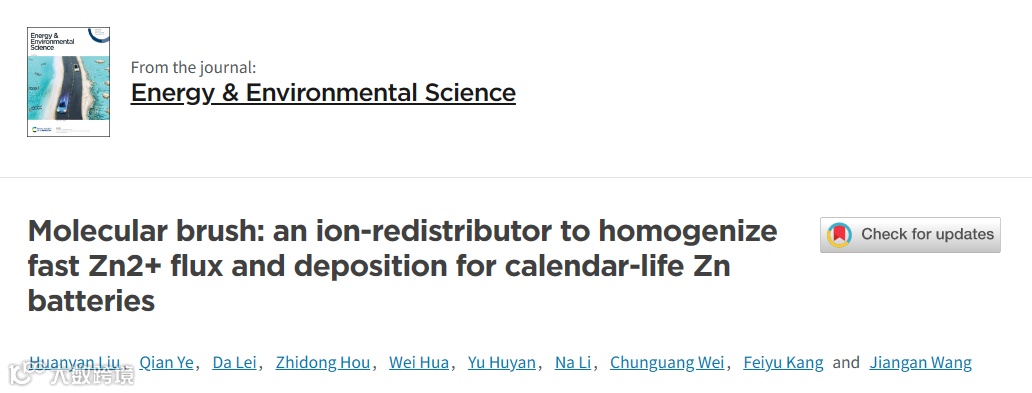 为了解决金属锌的问题,本文中,西北工业大学王建淦教授课题组,在能源材料类国际顶级期刊Energy & Environmental Science(影响因子:39.714)上发表题为“Molecular brush: an ion-redistributor to homogenize fast Zn2+ flux and deposition for calendar-life Zn batteries”的研究论文。该研究提出了一种多功能的表面接枝策略,通过光引发表面自由基聚合法,将坚固、轻盈且亲锌的PSPMA分子刷原位锚定在锌负极表面。