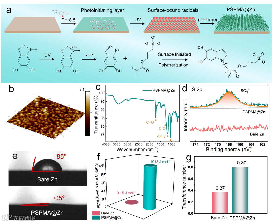 该工作采用光引发表面自由基聚合法在锌负极表面原位构筑了多功能PSPMA分子刷界面层(图1)。该界面层显著增强了电极表面润湿性,能够加速电极/电解质界面处Zn2+的扩散,导致Zn2+迁移数达到0.80。