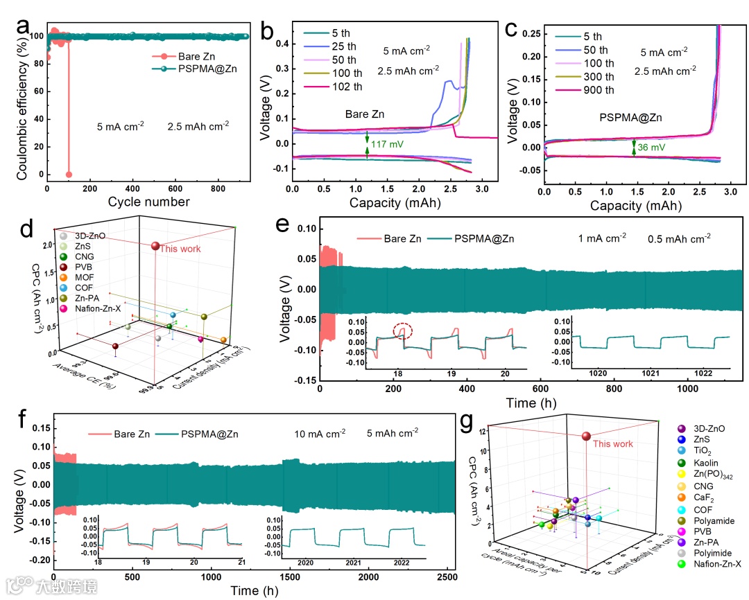 Fig. 2 (a) Coulombic efficiencies of bare Zn and PSPMA@Zn plating/stripping on Cu foil at 5 mA cm-2, and corresponding galvanostatic cycling curves for (b) bare Zn||Cu and (c) PSPMA@Zn||Cu asymmetry cells at specific cycles. (d) The comparison of CPC and average CE of the all-organic PSPMA@Zn with the reported inorganic, organic, and inorganic-organic composite protected Zn anodes. Cycling performance of bare Zn and PSPMA@Zn symmetric cells at (e) 1 mA cm-2 for 0.5 mAh cm-2 and (f) a high current density of 10 mA cm-2 for 5 mAh cm-2. (g) The CPC comparison of PSPMA@Zn symmetric cell with other reported literatures.