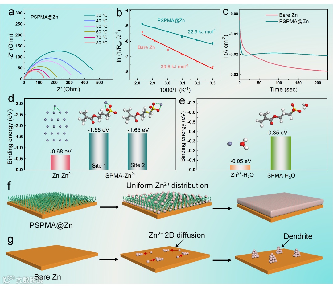 Fig. 3 Investigation of the molecular brushes on Zn deposition kinetics. (a) EIS curves of PSPMA@Zn at different temperatures, and (b) the calculated desolvation activation energies of both electrodes according to the Arrhenius equation. (c) I-t curves of bare Zn and PSPMA@Zn electrodes. (d) Theoretical calcualtion models and binding energies of Zn2+ with Zn substrate and preferent sites on the SPMA molecular. (e) Binding energies of H2O molecule with Zn2+ and SPMA and relating theoretical calculation models. Schematic illustration of the Zn2+ deposition mechanism on (f) PSPMA@Zn and (g) bare Zn.