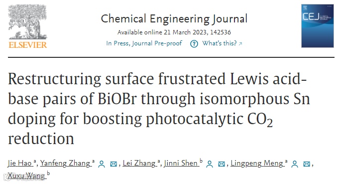 基于此,河北师范大学张艳峰教授&沈锦妮讲师&孟令鹏教授团队,在国际纳米领域知名期刊Chemical Engineering Journal 上发表题为“Restructuring surface frustrated Lewis acid-base pairs of BiOBr through isomorphous Sn doping for boosting photocatalytic CO2 reduction”的研究论文。