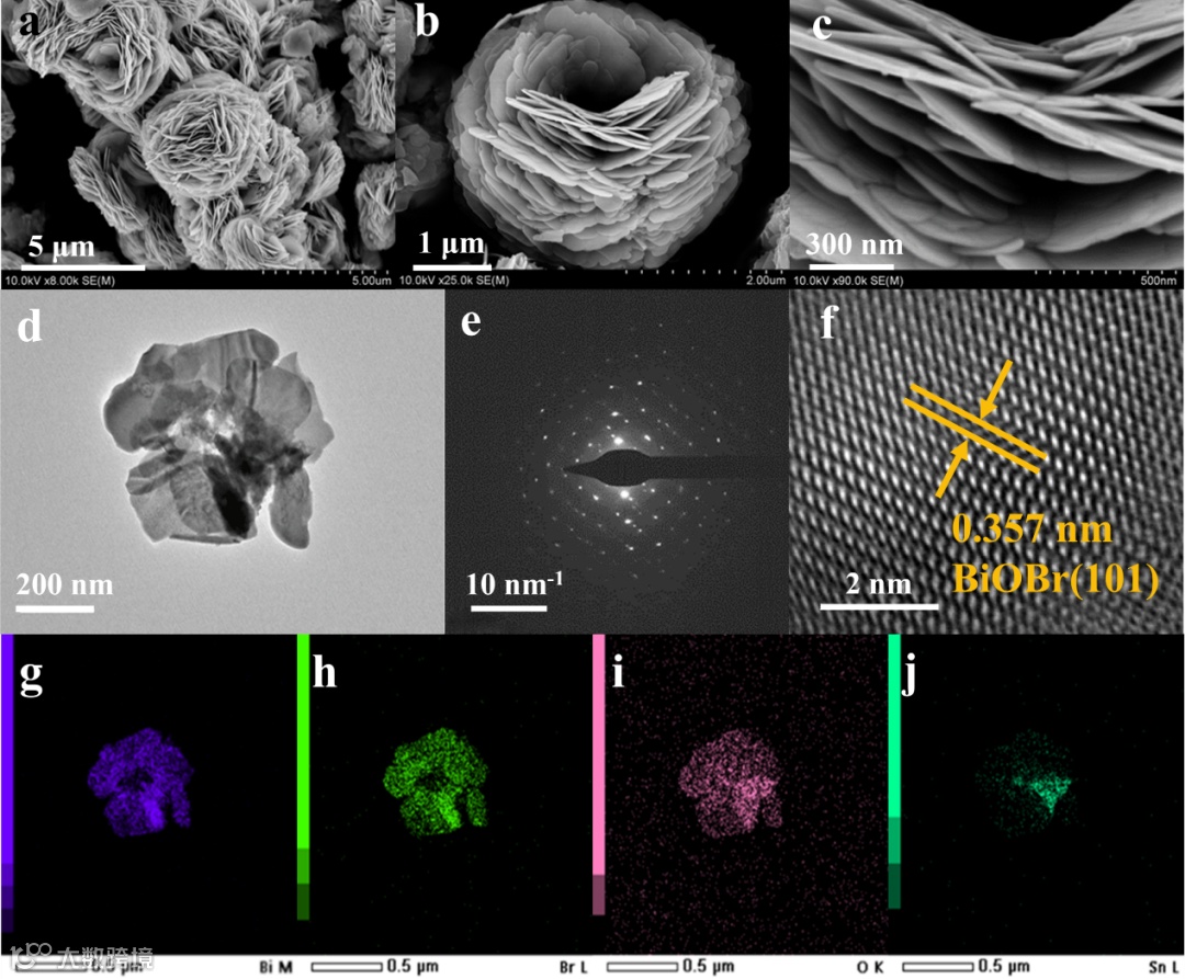 Figure 2 (a,b,c) SEM image, (d)TEM image (e) selected area electron diffraction (SAED) pattern, (f) atomic-resolution HAADF image and (g-j) EDX mapping of 4Sn-BiOBr