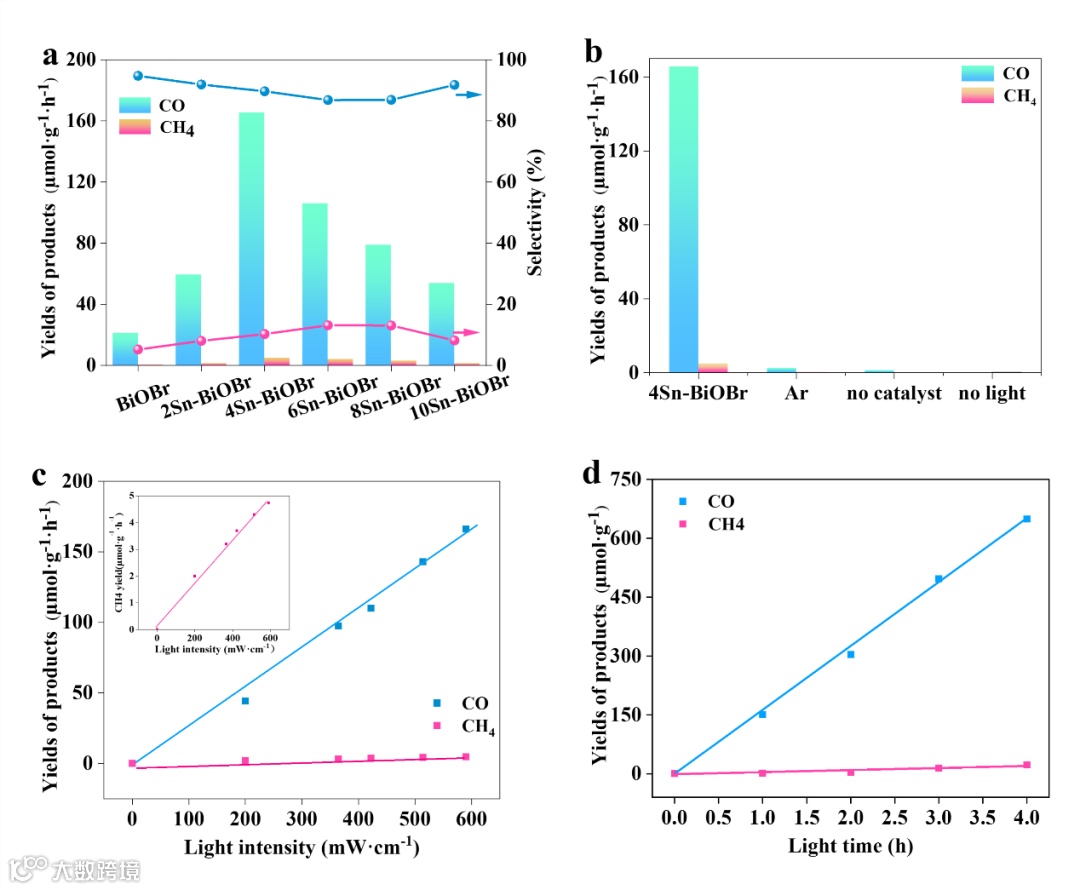 Figure 4 (a)Yields and selectivity of CO and CH4 over BiOBr and Sn-BiOBr under simulated sunlight, (b)yields of CO and CH4 over 4Sn-BiOBr under different reaction conditions, (c)yields of CO and CH4 (inset) over 4Sn-BiOBr at different light intensities, (d) yields of CO and CH4 over 4Sn-BiOBr at different irradiation time.