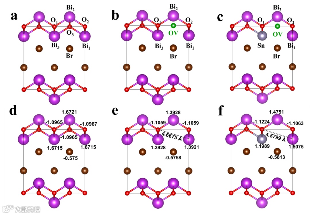 Figure3 (a-c) Optimal structure of perfect BiOBr(100), OVs-BiOBr(100) and Sn-OVs-BiOBr(100) (d-f) Bader charge of perfect BiOBr(100), OVs-BiOBr(100) and Sn-OVs-BiOBr (100).(Bi atom: purple, O atom: red, Br: brown, Sn: gray, Oxygen vacancy: green)