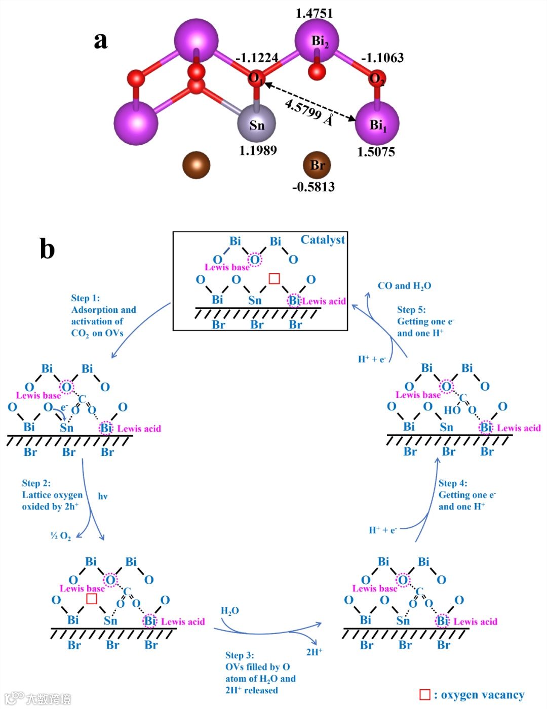 图5a给出4Sn-BiOBr的结构。根据原位FTIR、ESR、XPS和计算结果,提出光催化二氧化碳还原的机理,共包括5个反应步骤(图5b)。首先,二氧化碳在Sn-BiOBr的Lewis酸性位点和Lewis碱性位点上被吸附和激活(步骤1)。二氧化碳插入氧空位导致Sn-O键的电荷位移,相邻的晶格氧被两个光生空穴(2h+)氧化为 O2。