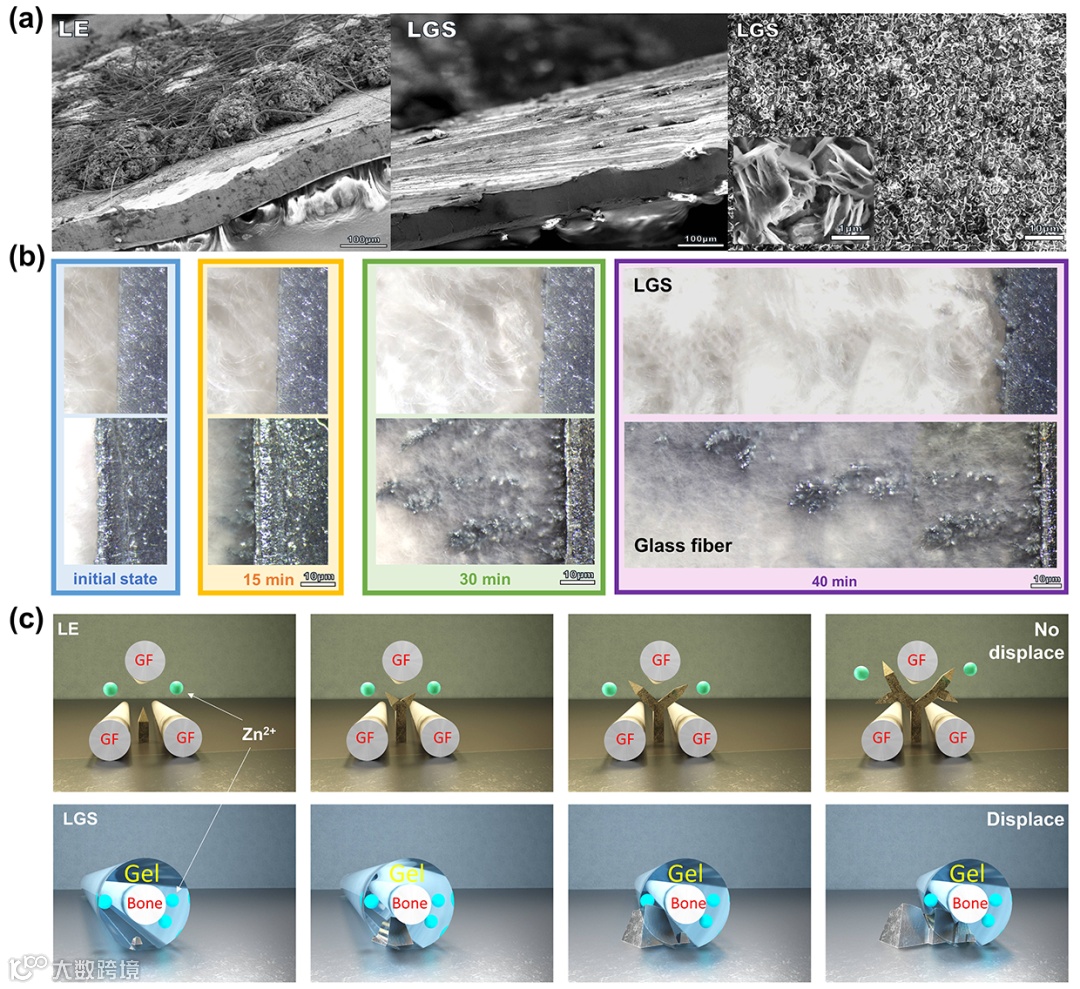 图3:(a)锌对称电池循环后锌片表面的SEM图像。(b)恒流沉积不同时间后,用LGS和LE组装的锌对称电池图像。它们都在电流密度为20 mA/cm2的情况下循环。(c)枝晶生长模式机理示意图