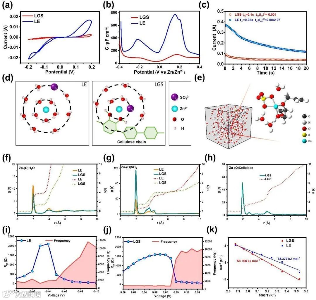 图2:(a)锌对称电池的CV曲线。(b)锌对称电池的微分电容与电位曲线。(c)时安培曲线(步进电压-0.5 V)。(d)水溶液ZnSO4和ZnSO4在纤维素参与下的溶剂化示意图。(e)AIMD得到的LGS中ZnSO4与纤维素的溶剂化。(f-h)AIMD在10 ps内得到的Zn2+溶剂化结构的径向分布函数(实线)和积分曲线(配位数,虚线)。(i)极化状态下玻璃纤维隔膜对称电池Rct的EIS测试。(j)极化状态下LGS对称电池Rct的EIS测试。(k)通过EIS测得的电荷转移活化能拟合曲线。