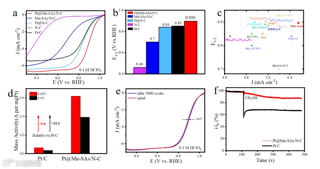 Figure 3. (a)ORR performance in acidic media. a) LSV curves and b) half-wave potentials of Pt@Mn-SAs/N-C, Mn-SAs/N-C, Pt@N-C, N-C and commercial Pt/C catalysts in 0.1 M HClO4 solution. c) Acidic ORR performance comparison of Pt@Mn-SAs/N-C with other reported catalysts, d) Mass activities of Pt@Mn-SAs/N-C and Pt/C catalysts at 0.85 V and 0.9 V. e) Acidic LSV curves of Pt@Mn-SAs/N-C before and after 5000 cycles, and inserted chronoamperometry test of Pt@Mn-SAs/N-C and Pt/C catalysts. f) Methanol tolerance tests of Pt@Mn-SAs/N-C and Pt/C catalysts in acidic media.