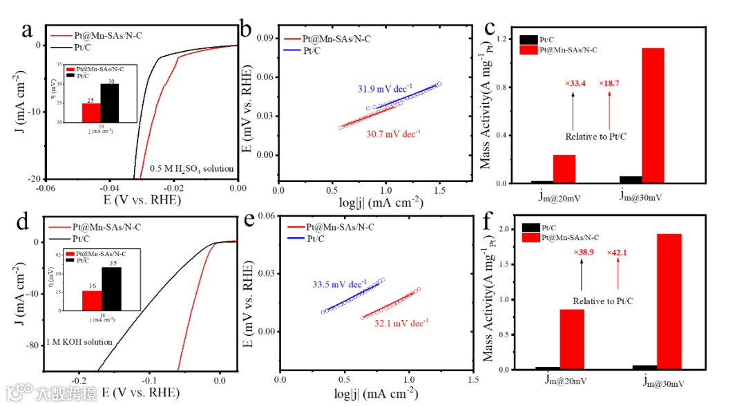 Figure 4. (a) LSV curves and b) corresponding Tafel slopes of Pt@Mn-SAs/N-C and Pt/C catalysts in acidic media. c) Mass activity of Pt@Mn-SAs/N-C and Pt/C at 20 and 30 mV in 0.5 M H2SO4 solution. d) LSV curves and e) corresponding Tafel slopes of Pt@Mn-SAs/N-C and Pt/C catalysts in alkaline media. f) Mass activity of Pt@Mn-SAs/N-C and Pt/C at 20 and 30 mV in 1 M KOH solution