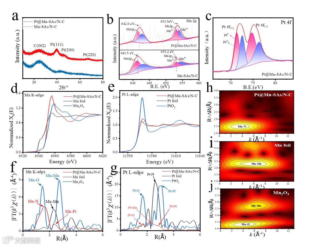 Figure 2. (a) XRD patterns of Pt@Mn-SAs/N-C and Mn-SAs/N-C. b) Mn 2p spectra of Pt@Mn-SAs/N-C and Mn-SAs/N-C. c) Pt 4f spectra of Pt@Mn-SAs/N-C. d) XANES and f) EXAFS spectra of Mn K-edge for Pt@Mn-SAs/N-C, Mn foil and Mn2O3. e) XANES and g) EXAFS spectra of Pt L3-edge for Pt@Mn-SAs/N-C, Pt foil and PtO2. WT-EXAFS of Mn K-edge for h) Pt@Mn-SAs/N-C, i) Mn foil and j) Mn2O3.
