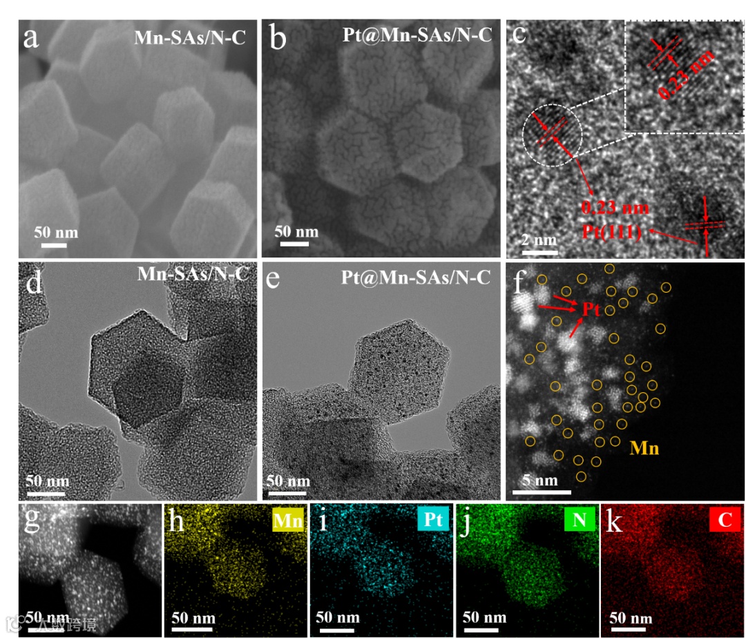 在催化剂合成过程中,活性铂纳米颗粒(NPs)通常会由于奥斯瓦尔德熟化或缺乏约束而发生严重团聚,导致活性位点数量和催化效率降低。因此,如何有效提升Pt的原子利用率仍然是一个很大的挑战。本研究利用MOF衍生的Mn-N-C框架作为基底,将高本征活性的Pt物种引入到单原子Mn-N-C体系中,采用逐步构筑的方法制备了Pt@Mn SAs/N-C材料。在该材料中,Mn单原子和Pt纳米颗粒共存。得益于高度分散的MnN4单原子位点(Mn)对Pt物种的强锚定作用,Pt纳米颗粒的团聚被有效抑制。Pt@Mn-SAs/N-C中的Pt平均粒径为2.43 nm,且分散均匀。此外,还具有超低的Pt载量(1.98 wt%)。
