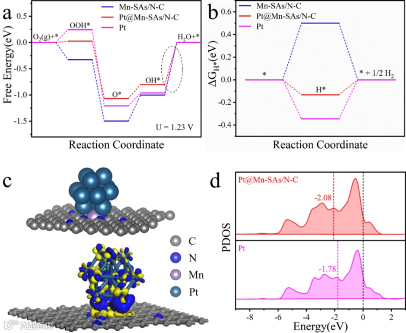 为进一步研究Pt物种与单原子Mn位点间的相互作用对催化活性的影响,进行了密度泛函理论(DFT)计算。在ORR的吉布斯自由能谱图中,Pt@Mn-N4的反应能势垒最小,为0.80 eV,优于Mn-SAs/N-C和商业Pt/C催化剂。同样,对于HER,Pt@Mn-SAs/N-C也具有的最低的ΔGH*值(-0.13 eV),远低于Mn-SAs/N-C和Pt催化剂。本征活性得到优化主要源于Pt和Mn-N4位点桥接处的电荷密度重新分布。电子从MnN4位点转移到邻接的Pt位点,与XPS分析结果一致。富电子Pt活性位点上的平均d带中心负移,削弱了其对关键OH*和H*中间体的吸附作用,从而降低了ORR/HER的反应能垒。