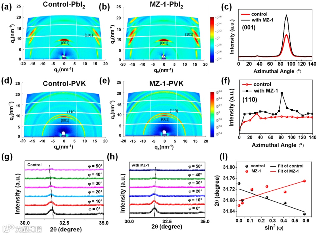 GIWAXS patterns of the (a) control PbI2 film, (b) MZ-1-modified PbI2 film, (d) control film and (e) MZ-1-modified perovskite film. Normalized intensity azimuthal pole figure of the (001) (c) and (110) (f) diffraction of samples. GIXRD spectra with various tilt angles for (g) control and (h) MZ-1 modified films in the depth of around 200 nm. (i) Linear fitting of 2θ-sin2φ for the studied perovskite films.
