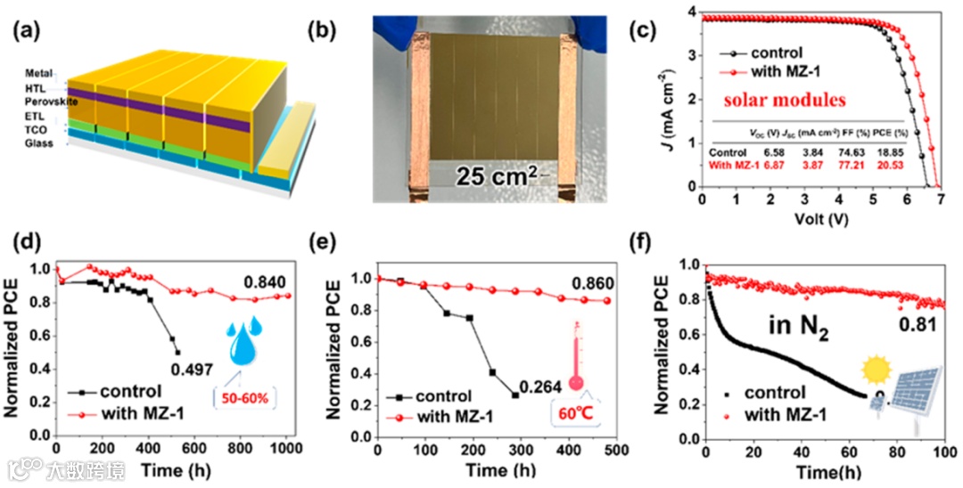 除了实验室中小面积PSCs效率的快速提升,钙钛矿电池模组(PSM)的开发也是推动PSM经济商业化的关键指标。得益于MZ-1对钙钛矿薄膜载流子复合显著抑制效果,利用MZ-1制备出效率为20.53%的面积为25cm2(孔径面积为12.6cm2)的效率大面积PSM,表明MZ-1在今后产业化制备的优势。同时,MZ-1螯合的PSC器件表现出在湿度,热应力,光照条件下优越的稳定性,这与器件中钙钛矿薄膜应变状态的改变密不可分。