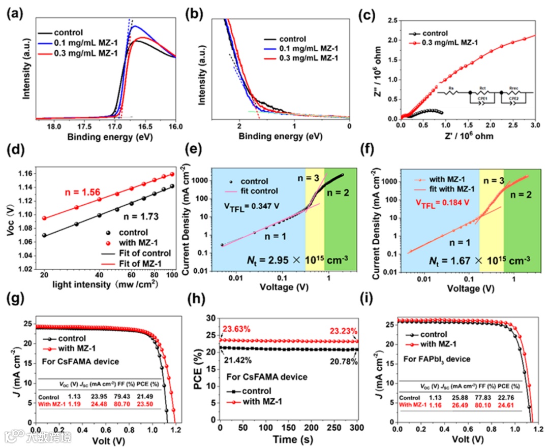 XRD表征发现引入MZ-1后钙钛矿薄膜的立方取向增强并伴随着PbI2衍射峰的降低,表明MZ-1可以促使钙钛矿反应更加充分。同时,表面SEM图显示经过MZ-1修饰后碘化铅的相(白色部分)明显减少,钙钛矿晶粒尺寸增大,薄膜结晶性得到提升。紫外吸收光谱(UV–vis)也证实出MZ-1修饰后,钙钛矿薄膜在500-800nm区域的光吸收有所提升。稳态光致发光光谱和时间分辨光致发光(TRPL)光谱以评估MZ-1的缺陷钝化效果。MZ-1 改性薄膜显着增强的 PL 强度表明薄膜质量有所提高。