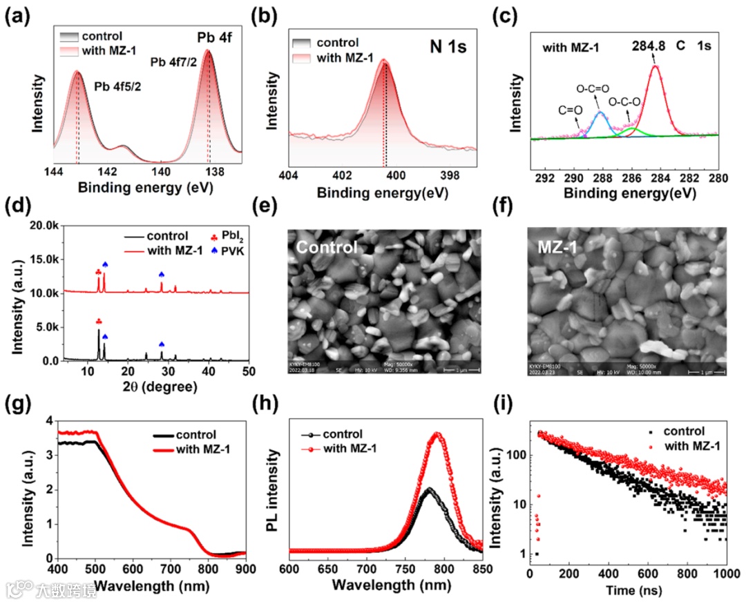 The XPS spectra for (a) Pb 4f, (b) N 1s and (c) C 1s from the control and MZ-1modified perovskite films. (d) The XRD graphs of perovskite films with and without MZ-1. Top-view SEM graphics of perovskite films (e) without and (f) with MZ-1 modified. (g) UV–vis absorption spectra of the perovskite film with and without MZ-1. (h) Steady-state PL and (i) TRPL decay of control and MZ-1-modified perovskite films.