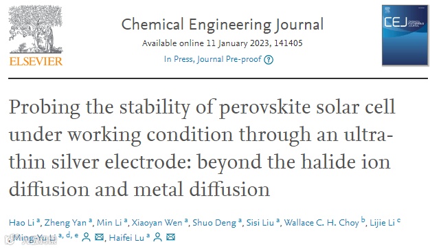 基于此,来自武汉理工大学的吕海飞教授与李明钰研究员合作,在国际知名期刊Chemical Engineering Journal上发表题为“Probing the stability of perovskite solar cell under working condition through an ultra-thin silver electrode: beyond the halide ion diffusion and metal diffusion”的研究文章。该文章通过研究完整器件结构中顶部超薄银电极在不同工作条件下的横向电阻变化,为评价钙钛矿太阳能电池的长期稳定性提供了一个新的视角。