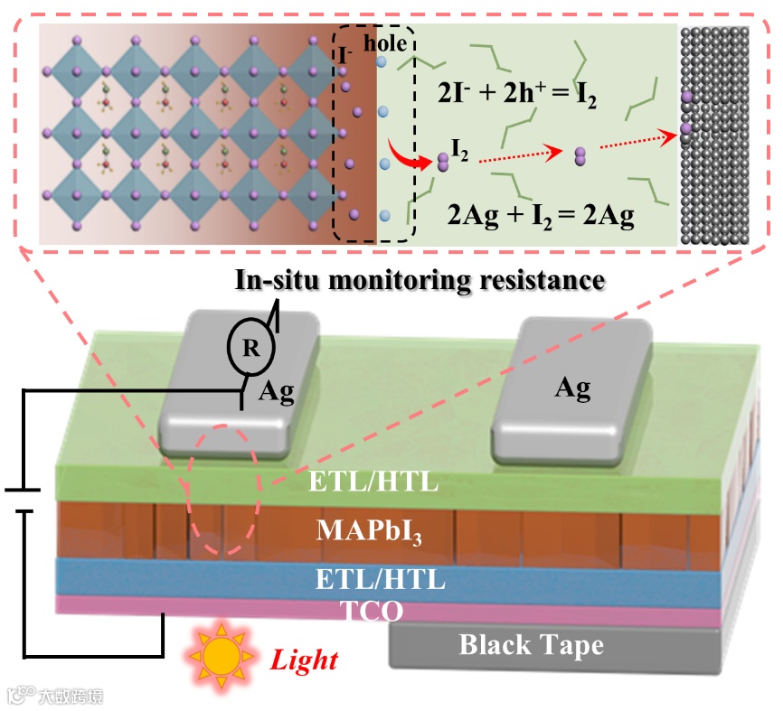 图1. 工作状态下钙钛矿太阳能电池的界面降解机理,以及基于原位探测的超薄银电极电阻测试方案。