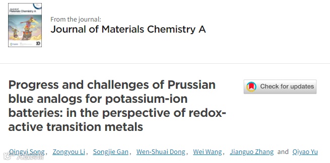 基于此,来自北京理工大学的于琪瑶研究员、张建国教授与北京科技大学的王伟教授合作,在国际知名期刊Journal of Materials Chemistry A上发表题为“Progress and challenges of Prussian blue analogs for potassium-ion batteries: in the perspective of redox-active transition metals”的综述文章。