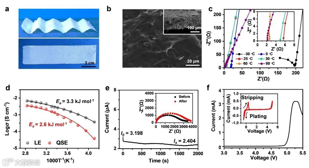 图2. 电解质的物理化学性质:(a) QSE膜的光学照片。(b) QSE膜的表面和截面(插图)SEM图。(c) QSE在-30至80 ℃温度范围内的阻抗谱,(d)QSE和LE的log σ-T-1(球)图和相应的VTF拟合结果(实线)。(e)Na|QSE|Na电池极化曲线,插图:极化前后的阻抗谱。(f) QSE膜的LSV和CV(插图)曲线