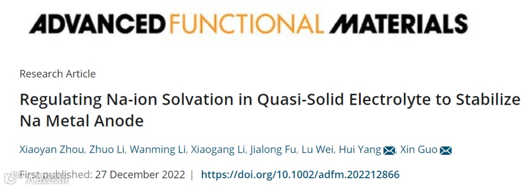 基于此,来自华中科技大学的郭新教授与杨辉教授合作,在国际知名期刊Advanced Functional Materials上发表题为“Regulating Na-ion Solvation in Quasi-Solid Electrolyte to Stabilize Na Metal Anode”的文章。该文章通过原位引发丙烯酸酯聚合得到了一种具有高室温离子电导率(1.4 mS cm−1@25℃)的准固体聚合物电解质(QSE)。QSE中,聚丙烯酸酯衍生聚合物网络中的羰基(O=C)参与Na+配位,有利于Na+在Na电极表面均匀、快速沉积,从而实现高稳定性的固态钠金属电池。