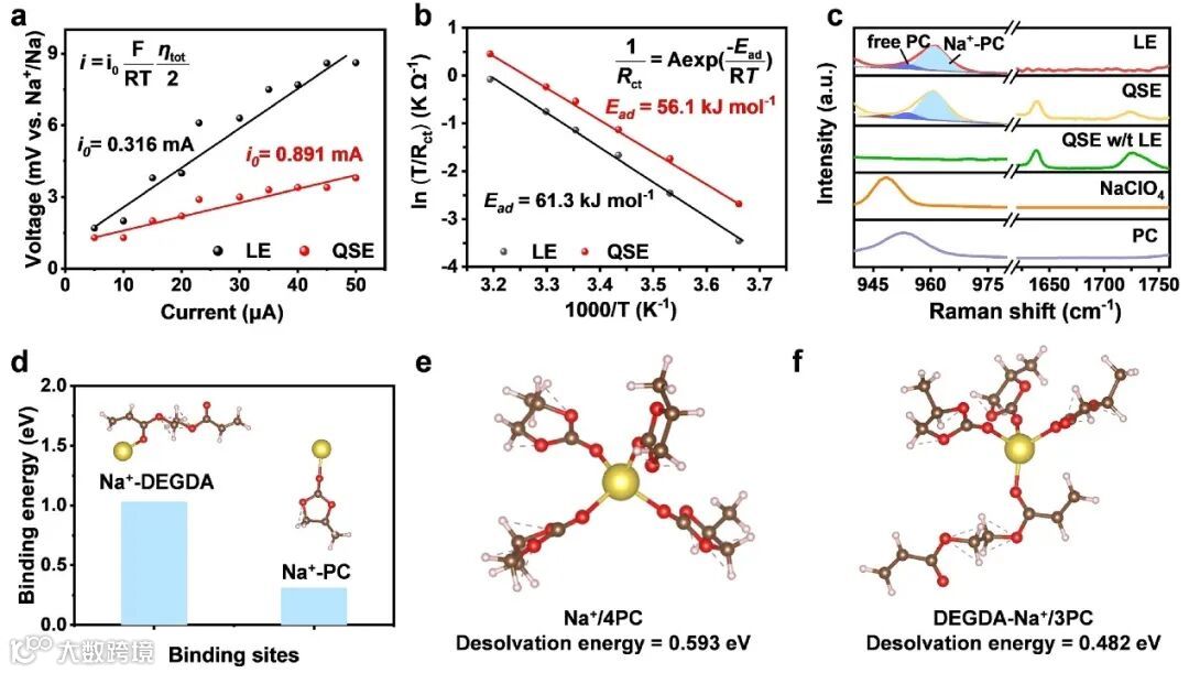 图4电解质的溶剂化结构与沉积行为:使用LE和QSE的Na||Na电池的(a) 交换电流密度和(b)表观活化能。(c) LE、QSE、不含LE的QSE、NaClO4、PC在940-980和1620-1760 cm-1范围内的Raman谱。(d) Na+-PC和Na+-DEGDA的构型和相应的结合能。(e)LE和(f)QSE中的优化Na+溶剂化结构以及相应的去溶剂化能。