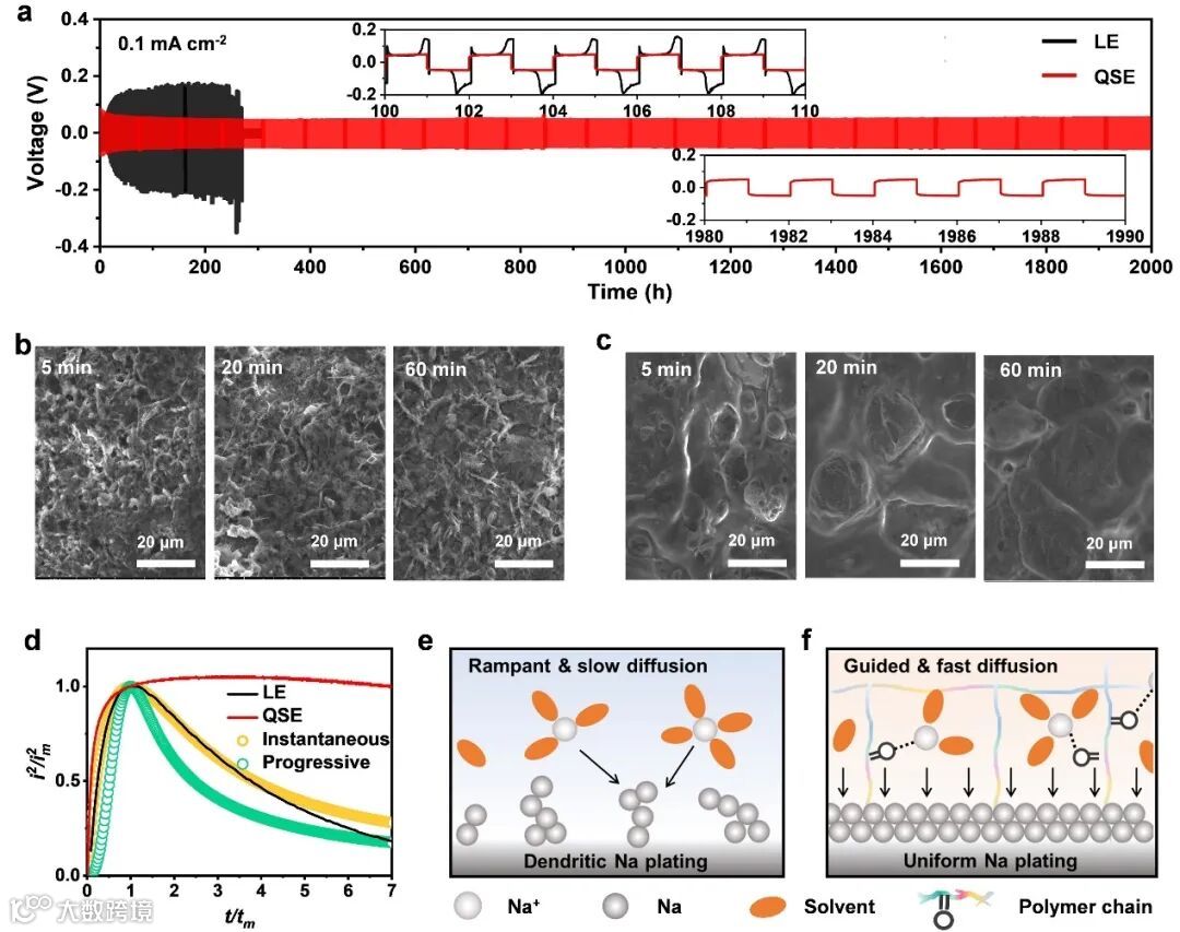 图3 电解质在Na||Na电池的循环与沉积:(a)使用LE和QSE的Na||Na电池在0.1 mA cm–2下的循环性能(插图:100–110 h和1980–1990 h的放大图)。(b)LE和(c)QSE中不同时间的Na沉积形貌。(d) 使用LE和QSE的Na||Na电池在-0.15 V下的无量纲极化曲线。(e)LE和(f)QSE中Na电极表面的Na沉积示意图。