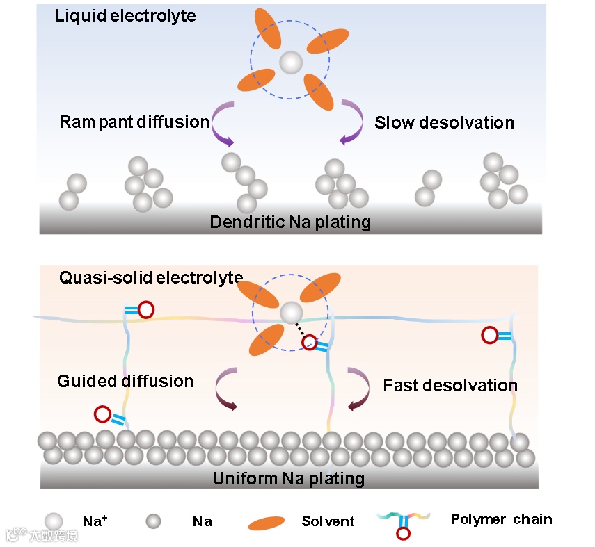 图1. 液体电解质(上)和准固体电解质(下)中的钠沉积示意图。
