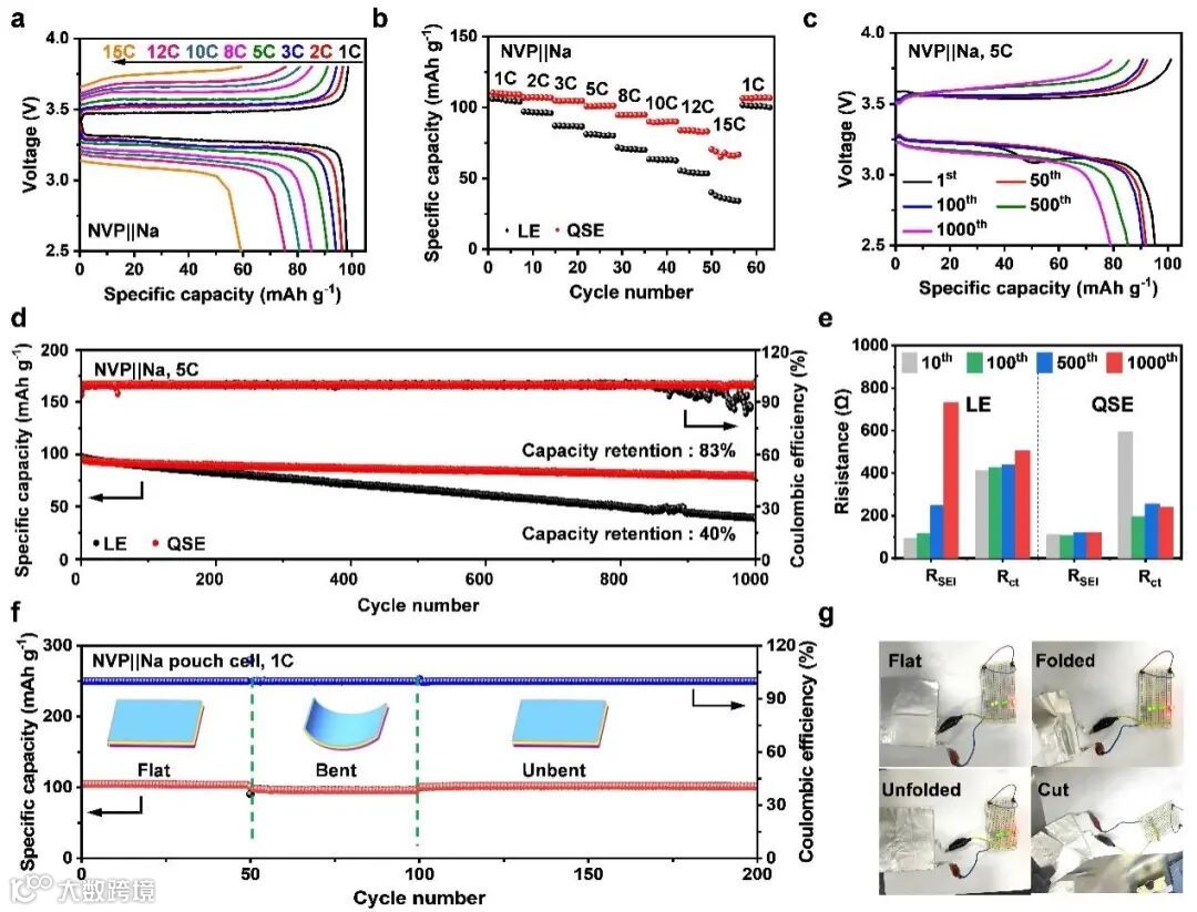图5 NVP||Na电池的电化学性能:(a)NVP|QSE|Na电池在不同速率下的恒流充放电曲线;(b)NVP|QSE|Na电池的倍率性能;使用LE和QSE的NVP||Na电池的(c)循环性能和(d)在不同循环后的RSEI和Rct;(f)在平坦、弯曲和未弯曲状态下,NVP|QSE|Na软包电池在1C下的循环性能;(g) NVP|QSE|Na软包电池在平坦、折叠、展开和切割状态下的性能。