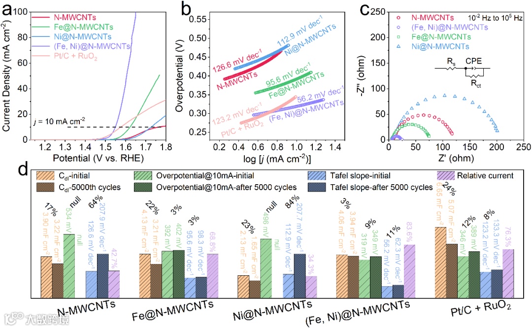 Fig. 4. (a) LSV curves of OER at a scan and rotation rates of 5 mV s−1 and 1600 rpm in O2-saturated 1 M KOH solution and (b) the corresponding Tafel plots. (c) EIS plots of the N-MWCNTs, Fe@N-MWCNTs, Ni@N-MWCNTs, and (Fe, Ni)@N-MWCNTs, with the inset showing the equivalent circuit used for fitting the experimental data (Rs, solution resistance; Rct, charge transfer resistance and CPE, constant phase element). (d) Cdl, overpotential, and Tafel slope before and after 5000 CV cycles and the relative current after 80000 seconds measured by chronoamperometric test at 1.6 V.