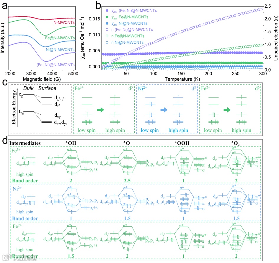 Fig. 3. (a) EPR spectra of N-MWCNTs, Fe@N-MWCNTs, Ni@N-MWCNTs, and (Fe, Ni)@N-MWCNTs. (b) χm plots for ZFC and the calculated number of the unpaired electrons in the 3d orbitals of Fe@N-MWCNTs, Ni@N-MWCNTs, and (Fe, Ni)@N-MWCNTs. (c) 3d electron configurations changes of Fe3+, Ni2+, and Fe2+. (d) The possible orbital interaction between cations and the intermediate species of OER and ORR.