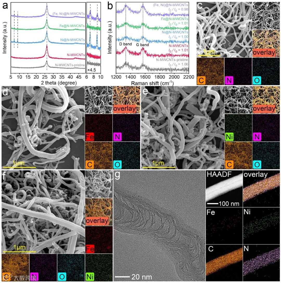 Fig. 1. (a) XRD patterns and (b) Raman spectrum of the pristine N-MWCNTs, N-MWCNTs, Fe@N-MWCNTs, Ni@N-MWCNTs, and (Fe, Ni)@N-MWCNTs. SEM images and EDS mapping images of (c) N-MWNCTs, (d) Fe@N-MWCNTs, (e) Ni@N-MWCNTs, and (f) (Fe, Ni)@N-MWCNTs. (g) TEM, HAADF-STEM image, and the corresponding EDS mapping images of (Fe, Ni)@N-MWCNTs.