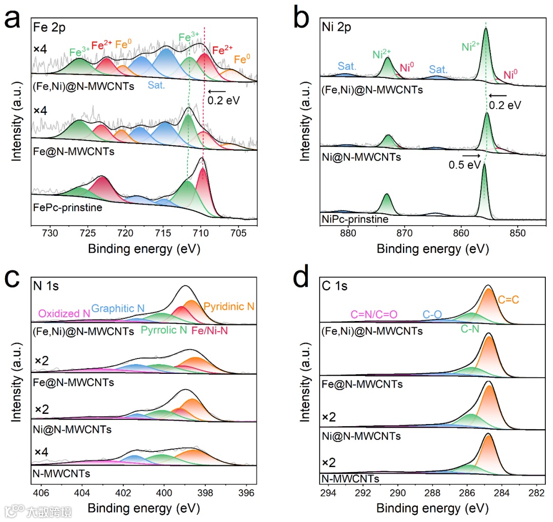 Fig. 2. (a) Fe 2p, (b) Ni 2p, (c) N 1s and (d) C 1s XPS spectra of (Fe, Ni)@N-MWCNTs, Fe@N-MWCNTs, Ni@N-MWCNTs, N-MWCNTs, the pristine FePc, and NiPc. The ×n above the curves represents that the image is magnified by n times in the vertical direction.