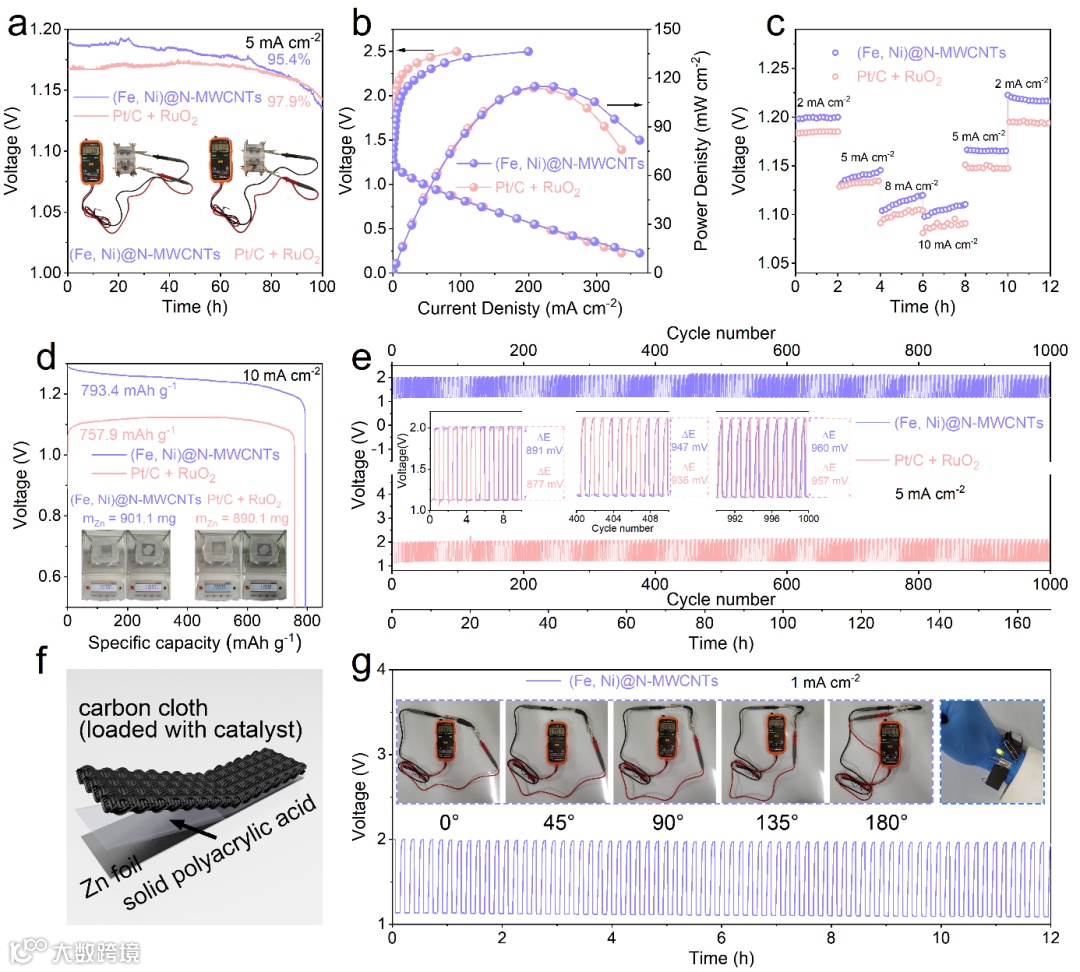 (Fe, Ni)@N-MWCNTs组装的水系锌空气电池表现出优异的性能和循环稳定性,驱动的可穿戴柔性锌空气电池在不同弯折角度下表现出良好的充放电循环,并可用作腕带点亮LED灯。