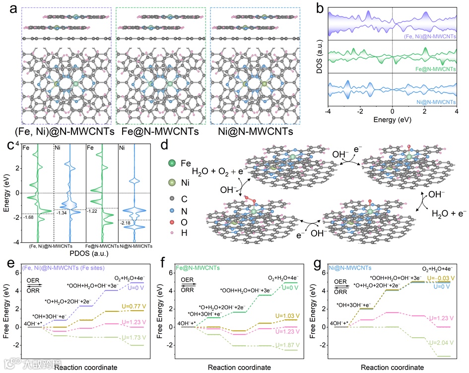 Fig. 6. (a) Schematic structure model of (Fe, Ni)@N-MWCNTs, Fe@N-MWCNTs, and Ni@N-MWCNTs from the side and top views. (b) DOS for (Fe, Ni)@N-MWCNTs, Fe@N-MWCNTs, and Ni@N-MWCNTs. (c) PDOS of Fe and Ni sites of (Fe, Ni)@N-MWCNTs, Fe@N-MWCNTs, and Ni@N-MWCNTs. (d) Reaction scheme with the intermediates of OER and ORR. Gibbs free energy diagrams of (e) (Fe, Ni)@N-MWCNTs (Fe sites), (f) Fe@N-MWCNTs, and (g) Ni@N-MWCNTs for the adsorption of intermediates at different voltages.