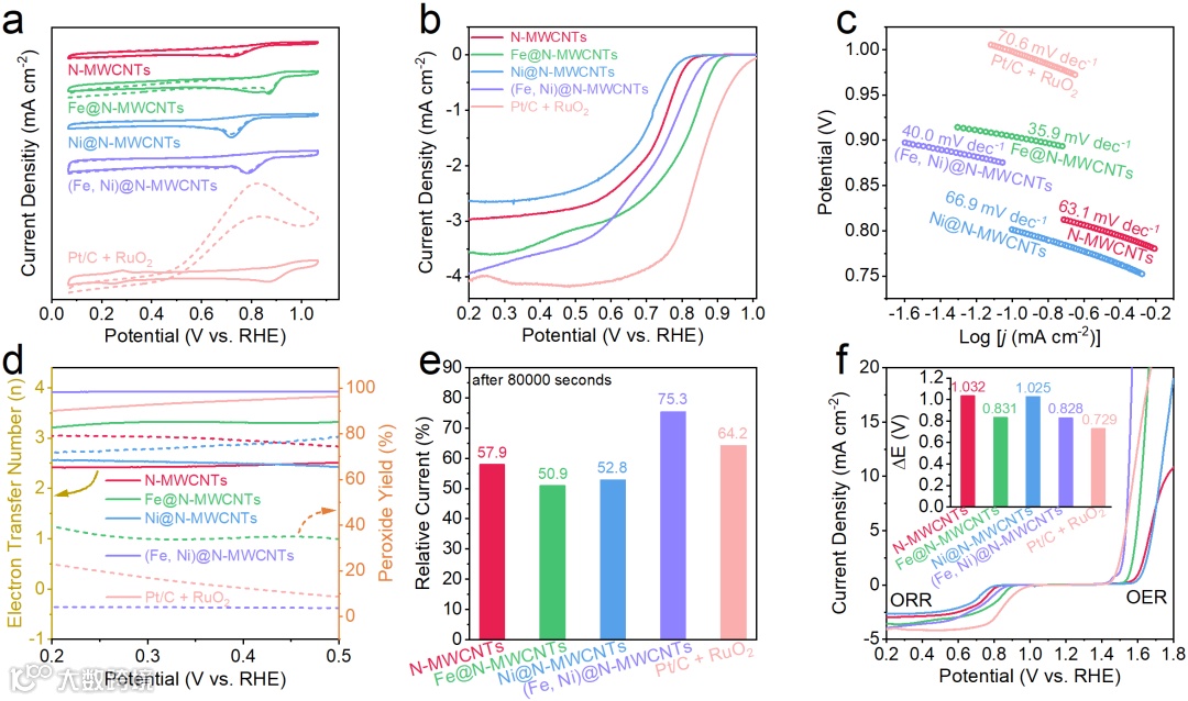 DFT理论计算进一步证明,FePc、NiPc和N-MWCNTs的协同作用可以增强(Fe,Ni)@N-MWCNTs费米能级以下的电子态,优化Fe-Ni位点d带中心以及平衡OER和ORR过程决速步之间的竞争。