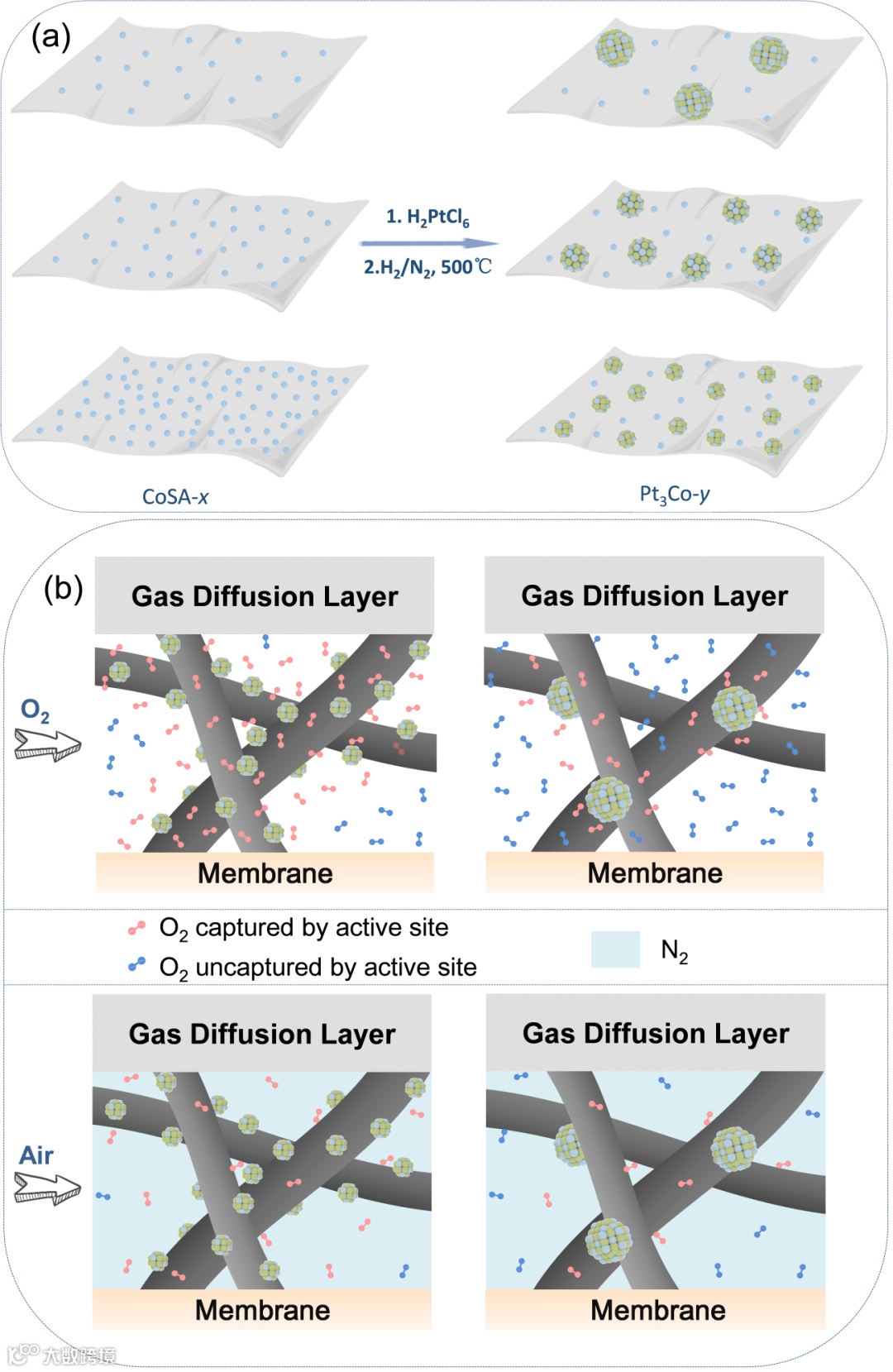 图1. (a)种子致密化合成策略,当引入等量Pt前驱体时,N掺杂碳上的Co种子越密集,单个Co种子捕获的Pt原子数相对越少,最终获得的Pt3Co颗粒越小;(b)当具有相同的阴极催化层厚度和相同的Pt负载时, Pt3Co合金颗粒越小,活性位点分布越密集,O2捕获效率越高,加速ORR动力学。