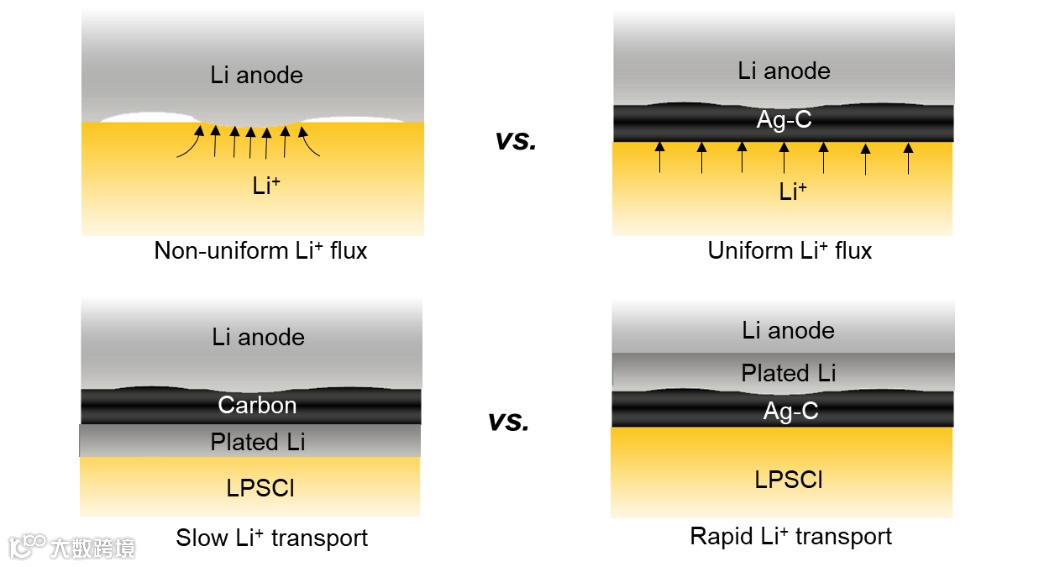 在固态电池中,中间层添加的金属粒子会影响锂电极的沉积位置。为了解Ag在中间层中的作用,我们比较了两种中间层(Ag-C和C)的表现。尽管电压曲线只有微小差异,但SEM图像显示沉积锂位置显著不同。使用纯碳中间层时锂沉积在电解质和中间层之间,而当中间层中存在Ag时,锂沉积在期望位置即中间层和Li阳极之间。只要电解质中的Li通量不超过中间层的Li极限传输能力,Ag-C和纯碳中间层都可以实现锂金属沉积在期望位置即中间层和Li阳极之间。但是,基于我们的制备条件,只有Ag-C在较高电流密度下使得锂金属沉积在期望的位置。碳中间层的Li传输不足会导致在中间层和固态电解质之间沉积锂。