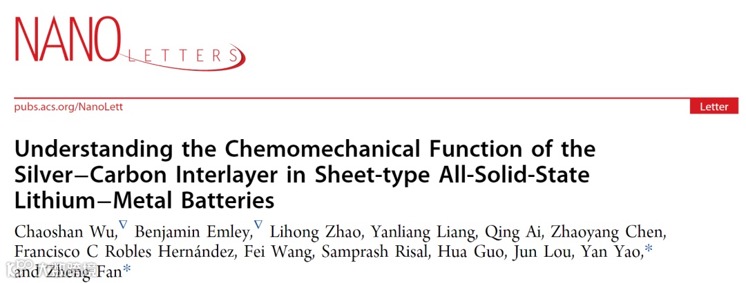 近日,来自休斯顿大学的樊征教授与姚彦教授合作,在国际知名期刊Nano Letters上发表题为“Understanding the Chemo-Mechanical Function of Silver-Carbon Interlayer in Sheet-type All-Solid-State Lithium-Metal Batteries”的观点文章。该文章分析了Ag-C中间层在保持锂金属负极界面稳定方面的功能。